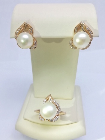 ЗОЛОТОЙ КОМПЛЕКТ: СЕРЬГИ И КОЛЬЦО С ФИАНИТАМИ И ЖЕМЧУГОМ 10,51 грамм