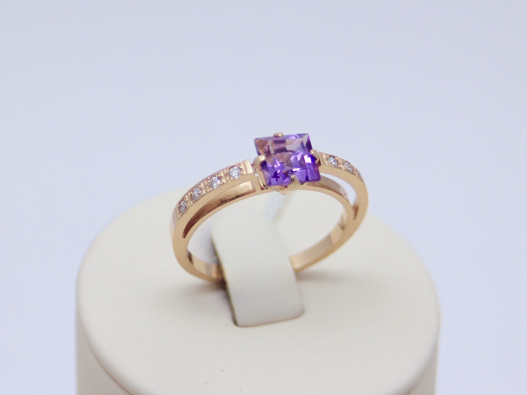 Золотое кольцо из красного золота 585 пробы, вставка 8 бриллиантов, аметист, размер 18, вес 2,75 г Вставки: 8 Бриллиант Кр-57-0,104 3/5 А - 8 бриллиантов классической круглой огранки 57 граней (специальная форма огранки камня, чтобы с учетом преломления света получить максимальный блеск) общим весом 0,104 карат, цвет 3 (великолепно), чистота 5 (хорошо), качество огранки отличное; 1 Аметист. Аметист приносит чувство умиротворения, дает защиту от негативного воздействия окружающих людей. Ведет по правильному счастливому пути, не дает совершать ошибки. Развивает ясновидение, а также другие сверхспособности. Помогает наладить семейные и рабочие отношения. Качество сплава ювелирного изделия подтверждено клеймом Российской государственной пробирной инспекции, изделие соответствует требованиям отраслевого ювелирного стандарта ОСТ 117-3-002-95.